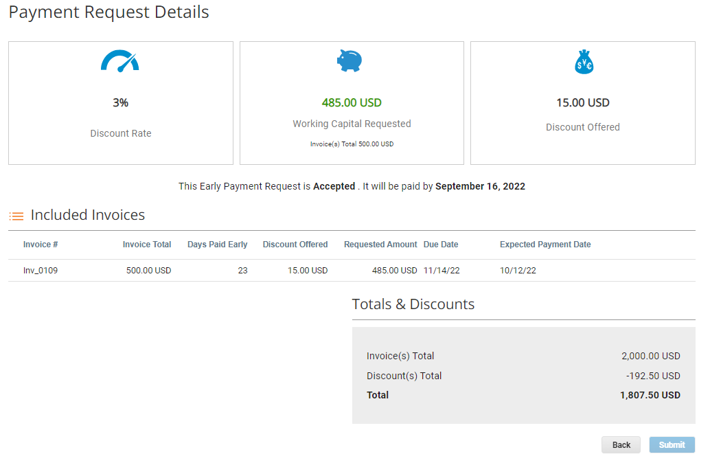 Coupaの顧客が早期支払いリクエストを正常に使用するには、割引プログラムに登録する必要があります。詳細は、「早期支払割引設定」を参照してください。